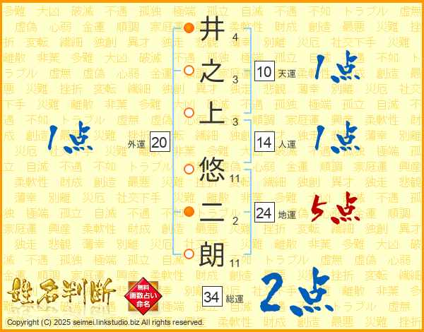 井(4画)之(3画)上(3画) 悠(11画)二(2画)朗(11画)