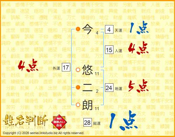 生活面を象徴する運勢です。外部から受ける影響力を表し、結婚運、家庭運や職場、環境への順応性を表します。総運から人運を引いた画数。姓や名が1文字の場合を除く。