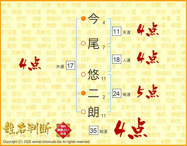 今(4画)尾(7画) 悠(11画)二(2画)朗(11画)