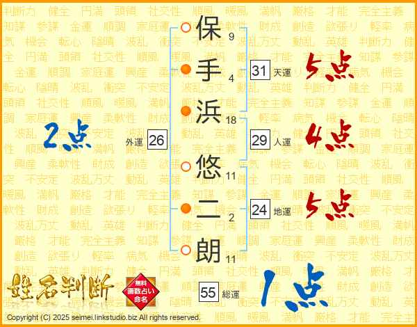 保(9画)手(4画)浜(18画) 悠(11画)二(2画)朗(11画)