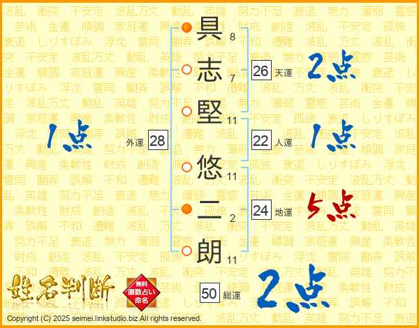 具(8画)志(7画)堅(11画) 悠(11画)二(2画)朗(11画)