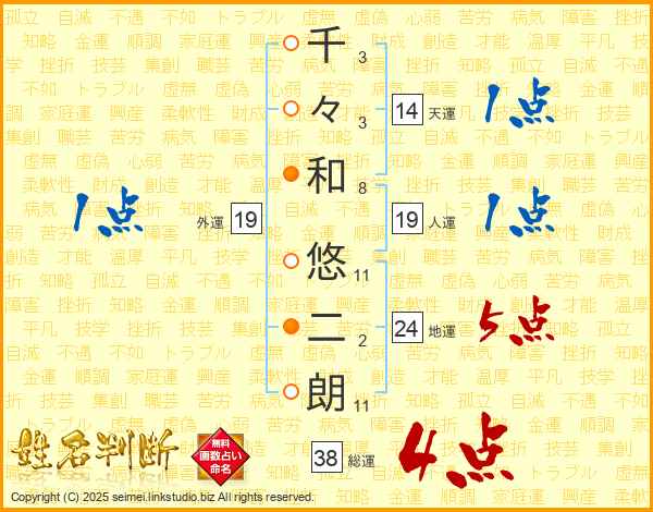 千(3画)々(3画)和(8画) 悠(11画)二(2画)朗(11画)
