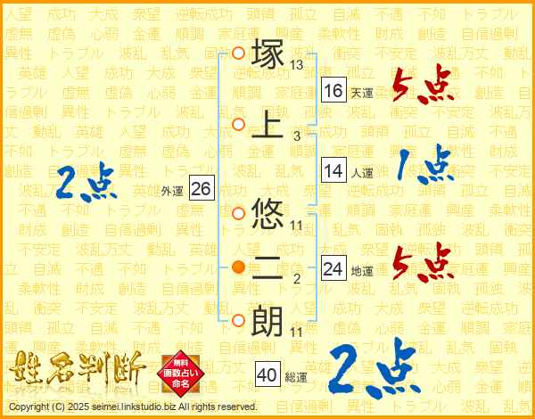 塚(13画)上(3画) 悠(11画)二(2画)朗(11画)