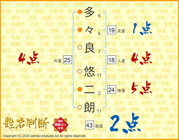 多(6画)々(6画)良(7画) 悠(11画)二(2画)朗(11画)