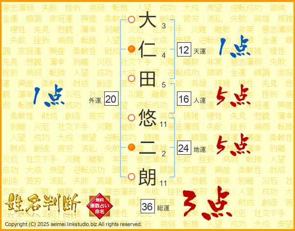 大(3画)仁(4画)田(5画) 悠(11画)二(2画)朗(11画)