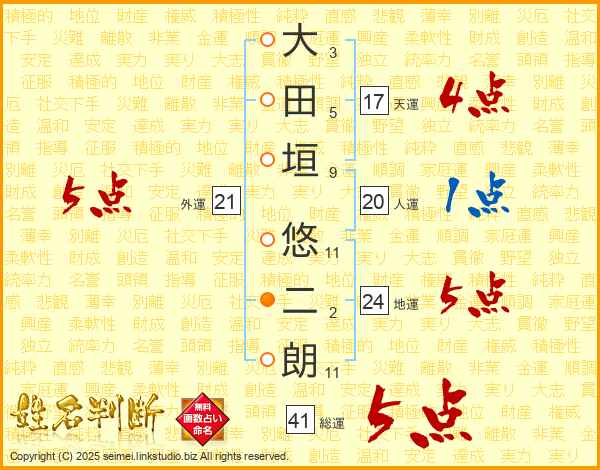 大(3画)田(5画)垣(9画) 悠(11画)二(2画)朗(11画)