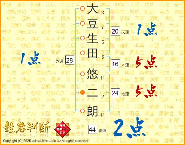 大(3画)豆(7画)生(5画)田(5画) 悠(11画)二(2画)朗(11画)