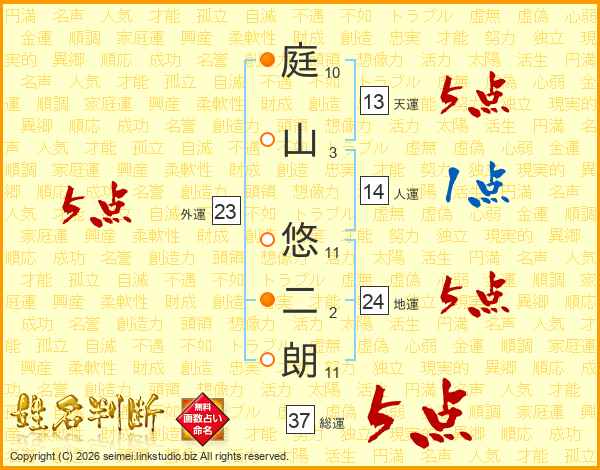庭(10画)山(3画) 悠(11画)二(2画)朗(11画)