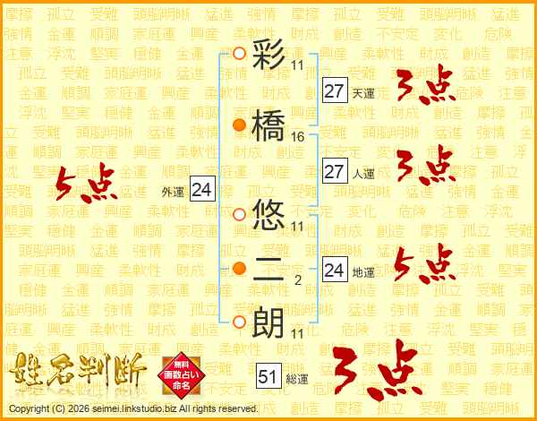 彩(11画)橋(16画) 悠(11画)二(2画)朗(11画)