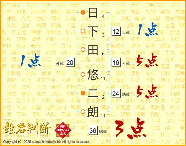 日(4画)下(3画)田(5画) 悠(11画)二(2画)朗(11画)