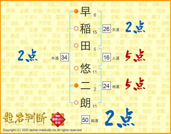 早(6画)稲(15画)田(5画) 悠(11画)二(2画)朗(11画)
