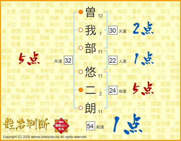 曽(12画)我(7画)部(11画) 悠(11画)二(2画)朗(11画)