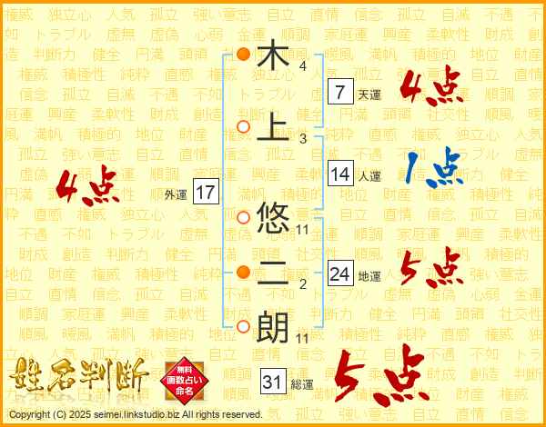 木(4画)上(3画) 悠(11画)二(2画)朗(11画)