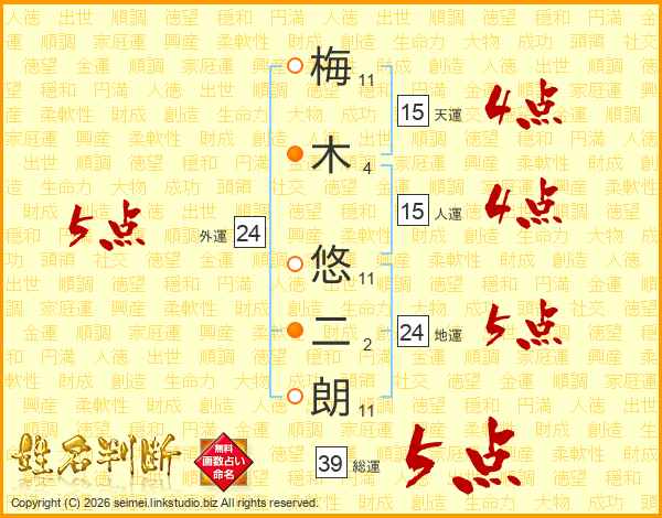 梅(11画)木(4画) 悠(11画)二(2画)朗(11画)
