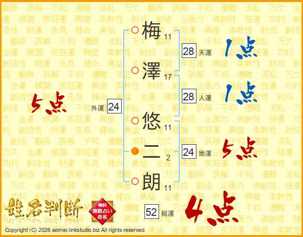 梅(11画)澤(17画) 悠(11画)二(2画)朗(11画)