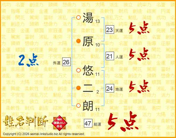 湯(13画)原(10画) 悠(11画)二(2画)朗(11画)