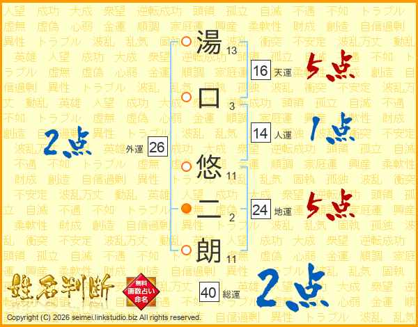 湯(13画)口(3画) 悠(11画)二(2画)朗(11画)