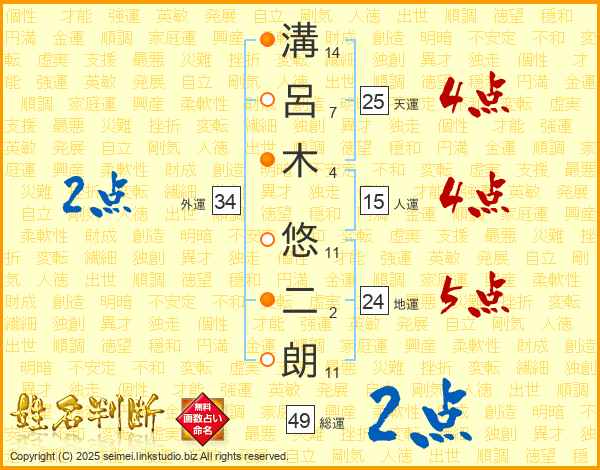 溝(14画)呂(7画)木(4画) 悠(11画)二(2画)朗(11画)