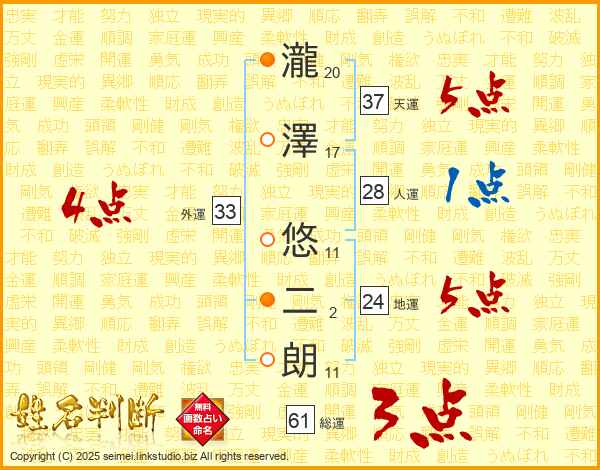 瀧(20画)澤(17画) 悠(11画)二(2画)朗(11画)
