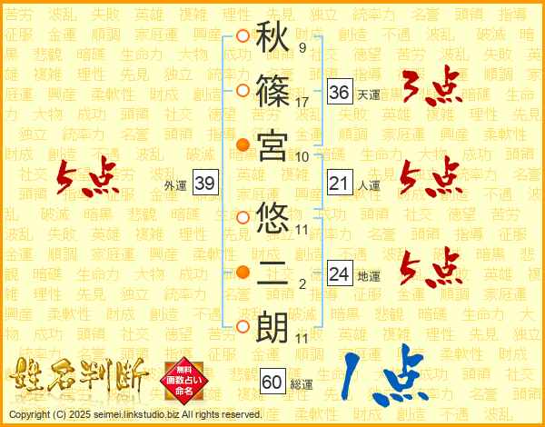 秋(9画)篠(17画)宮(10画) 悠(11画)二(2画)朗(11画)