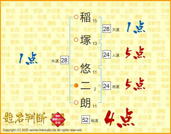 稲(15画)塚(13画) 悠(11画)二(2画)朗(11画)