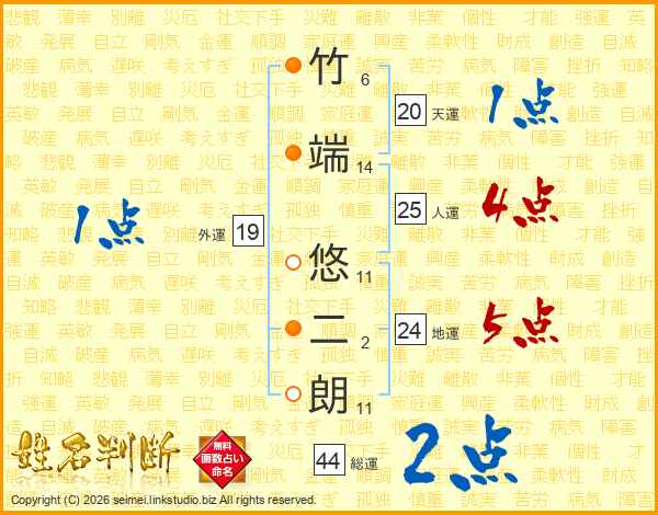 竹端悠二朗さんの総運は44画の2点!