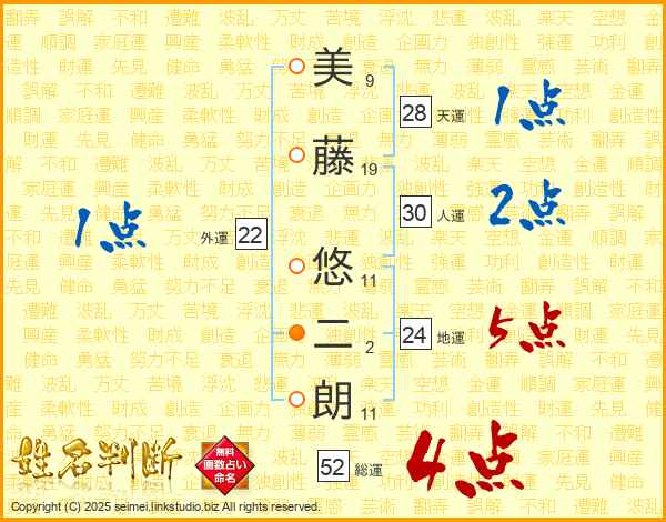 美(9画)藤(19画) 悠(11画)二(2画)朗(11画)