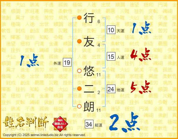 行(6画)友(4画) 悠(11画)二(2画)朗(11画)