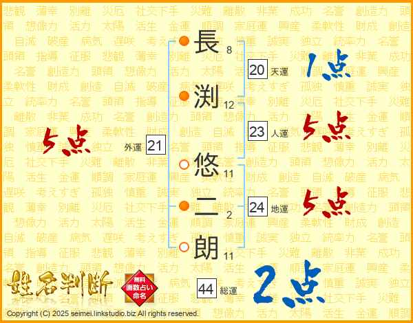 長(8画)渕(12画) 悠(11画)二(2画)朗(11画)
