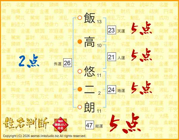 飯(13画)高(10画) 悠(11画)二(2画)朗(11画)