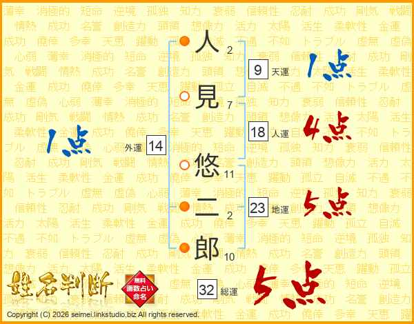 人(2画)見(7画) 悠(11画)二(2画)郎(10画)