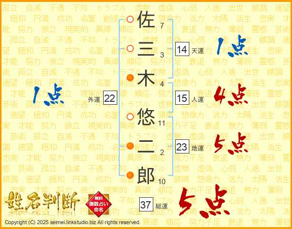 佐(7画)三(3画)木(4画) 悠(11画)二(2画)郎(10画)