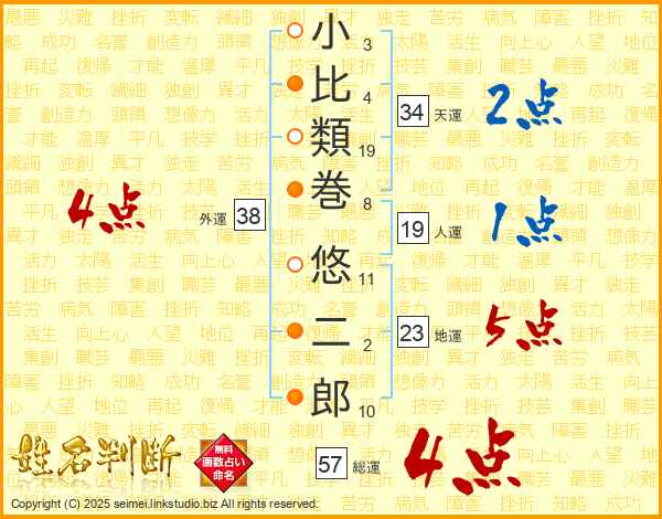 小(3画)比(4画)類(19画)巻(8画) 悠(11画)二(2画)郎(10画)