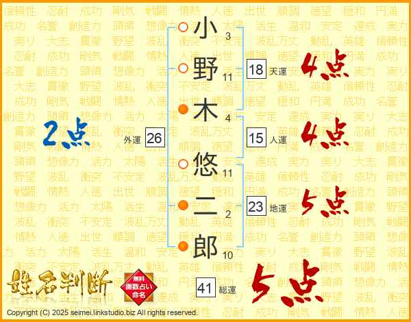 小(3画)野(11画)木(4画) 悠(11画)二(2画)郎(10画)