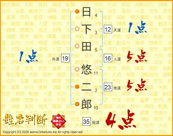日(4画)下(3画)田(5画) 悠(11画)二(2画)郎(10画)