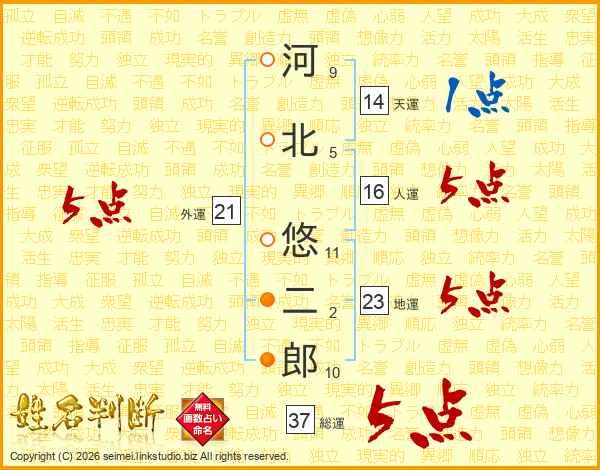 河北悠二郎さんの総運は37画の5点!