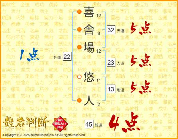喜(12画)舎(8画)場(12画) 悠(11画)人(2画)