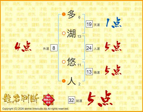 あなたの人生を表す1番重要な運勢です。生涯を通じて影響する総合運となり、主に50歳以降の晩年期に影響を及ぼします。苗字と名前の合計画数。