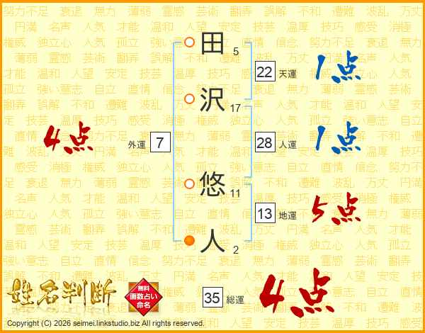 田沢悠人さんの総運は35画の4点!