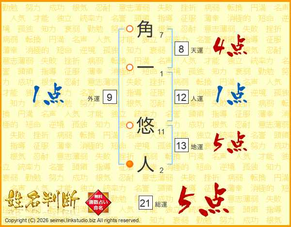 角一悠人さんの総運は21画の5点!