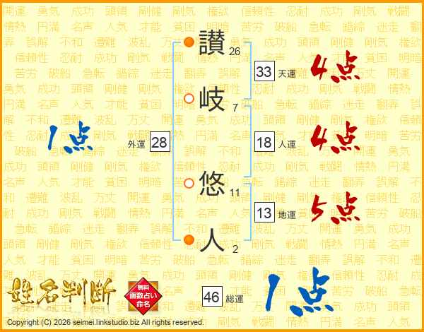 讃(26画)岐(7画) 悠(11画)人(2画)