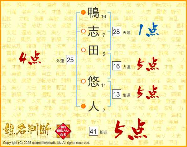 鴨(16画)志(7画)田(5画) 悠(11画)人(2画)