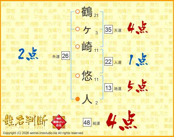 鶴ヶ崎悠人さんの総運は48画の4点!