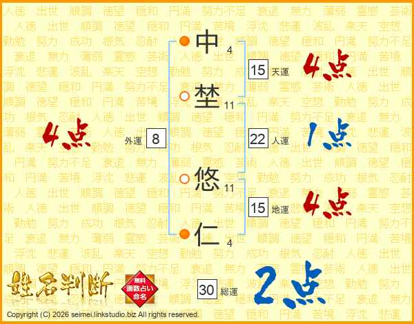 中(4画)埜(11画) 悠(11画)仁(4画)