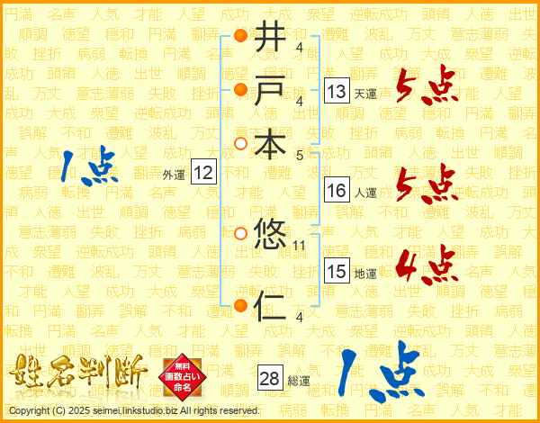 井(4画)戸(4画)本(5画) 悠(11画)仁(4画)