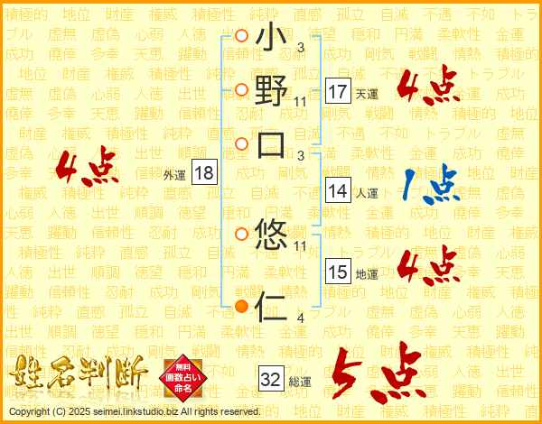 小(3画)野(11画)口(3画) 悠(11画)仁(4画)