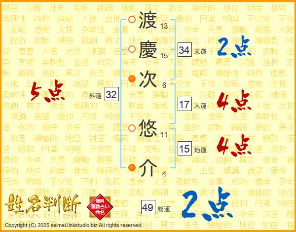 渡(13画)慶(15画)次(6画) 悠(11画)介(4画)