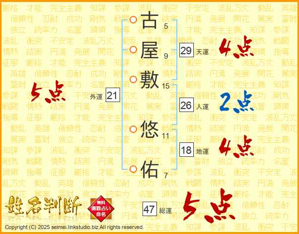 古(5画)屋(9画)敷(15画) 悠(11画)佑(7画)