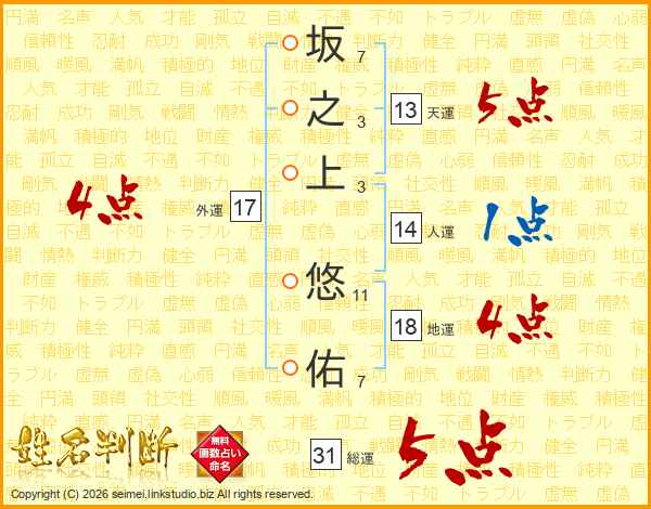 坂之上悠佑さんの総運は31画の5点!