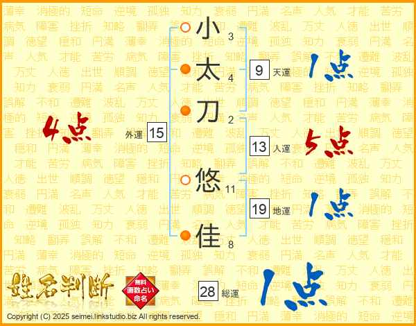 小(3画)太(4画)刀(2画) 悠(11画)佳(8画)